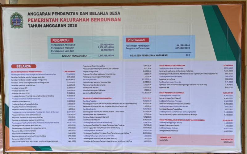 Bendungan SIDA - Sebagai wujud keterbukaan informasi publik bagi masyarakat Kalurahan Bendungan maupun yang lainnya, Pemerintah Kalurahan Bendungan memasang Banner yang berisi info grafis Anggaran Pendapatan dan Belanja Kalurahan tahun 2026 di papan pengumuman Balai kalurahan Bendungan dan di PKM Kalurahan Bendungan. masyarakat bisa mengakses dengan membaca secara langsung di papan pengumuman yang telah disediakan.