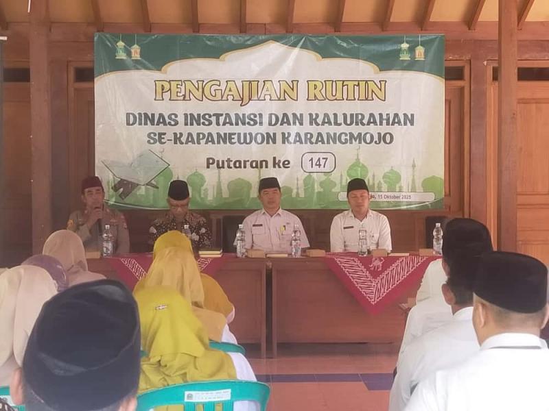 Bendungan SIDA - Pengajian Dinas, Instansi dan Kalurahan seKapanewon Karangmojo merupakan agenda rutin setiap bulan, dengan pelaksanaan secara bergiliran tempatnya. Pada hari Rabu (15/10/2025) pukul 09.00 WIB, pengajian bertempat di Kalurahan Bendungan dengan dihadiri oleh Forkompinka, Polsek, Koramil, KUA, Kalurahan seKapanewon, SD Bendungan 1, SD Bendungan 2, dan SD Bendungan 3 dengan personil kurang lebih ada 100 orang.
